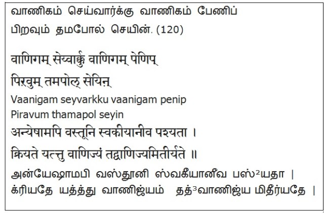 பிறவும் தமபோல் பேணிச் செயின் -பிறர் பொருளையும் தம்பொருள் போலப் பேணிச் செய்யின்; வாணிகம் செய்வார்க்கு வாணிகம் – வாணிகஞ் செய்வார்க்கு நன்றாய் வாணிகம் ஆம். (பிறவும் தமபோல் செய்தலாவது, கொள்வது மிகையும் கொடுப்பது குறையும் ஆகாமல் ஒப்ப நாடிச் செய்தல். இப்பாட்டு மூன்றனுள், முன்னைய இரண்டும் அவையத்தாரை நோக்கின்; எனையது வாணிகரை நோக்கிற்று, அவ்விருதிறத்தார்க்கும் இவ்வறம் வேறாகச் சிறந்தமையின்.).