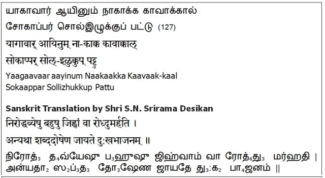 யாகாவாராயினும் நாகாக்க – தம்மால் காக்கப்படுவன எல்லாவற்றையும் காக்க மாட்டாராயினும் நாவொன்றனையும் காக்க, காவாக்கால் சொல் இழுக்குப்பட்டுச் சோகாப்பர் – அதனைக் காவாராயின் சொல் இழுக்குப்பட்டுச் சோகாப்பர் – அதனைக் காவாராயின் சொற்குற்றத்தின்கண் பட்டுத் தாமே துன்புறுவர். (‘யா’ என்பது அஃறிணைப் பன்மை வினாப்பெயர். அஃது ஈண்டு எஞ்சாமை உணர நின்றது. முற்று உம்மை விகாரத்தால் தொக்கது. சொற்குற்றம் – சொல்லின்கண் தோன்றும் குற்றம். ‘அல்லாப்பர்செம்மாப்பர்’ என்பன போலச் ‘சோகாப்பர்’ என்பது ஒரு சொல்.).