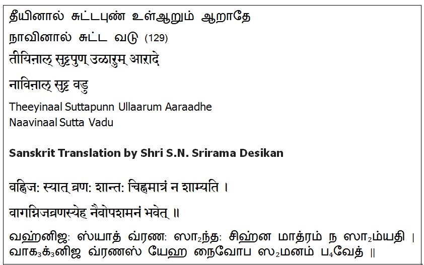 தீயினால் சுட்டபுண் உள் ஆறும் – ஒருவனை ஒருவன் தீயினால் சுட்ட புண் மெய்க்கண் கிடப்பினும், மனத்தின்கண், அப்பொழுதே ஆறும்; நாவினால் சுட்ட வடு ஆறாது – அவ்வாறன்றி வெவ்வுரை உடைய நாவினால் சுட்ட வடு அதன் கண்ணும் எஞ்ஞான்றும் ஆறாது. (ஆறிப்போதலால் தீயினால் சுட்டதனைப் ‘புண்’ என்றும், ஆறாது கிடத்தலால் நாவினால் சுட்டதனை ‘வடு’ என்றும் கூறினார். தீயும் வெவ்வுரையும் சுடுதல் தொழிலான் ஒக்கும் ஆயினும், ஆறாமையால் தீயினும் வெவ்வுரை கொடிது என்பது போதரலின், இது குறிப்பான் வந்த வேற்றுமை அலங்காரம். இவை மூன்று பாட்டானும் மொழி அடக்கம் கூறப்பட்டது.
