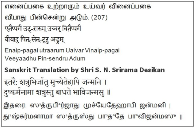 In couplet 207 he says that one can even manage to escape the effects of enmity during one’s life time, but cannot escape the enemy created by one’s bad deeds which will assiduously pursue, conquer and ruin him continuously in all his future births.