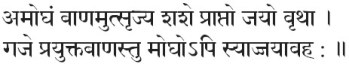 அமோக⁴ம் பா³ண-முத்ஸ்ருஜ்ய ஸ²ஸே² ப்ராப்தோ ஜயோ வ்ருதா² |