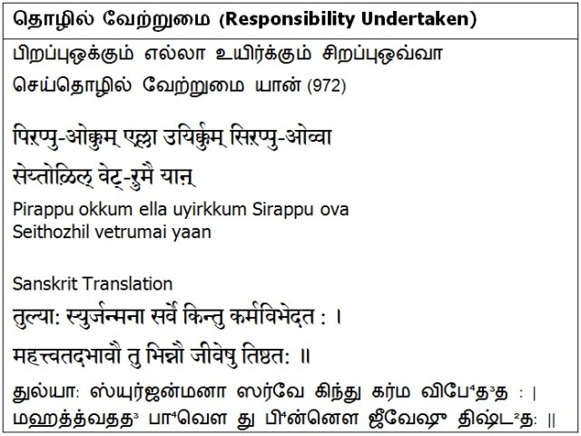 Saint Thiruvalluvar in the three following couplets emphasizes that ‘Everybody is equal at birth. Only by practice of virtues and execution of responsibilities associated with roles, does one attain greatness”.